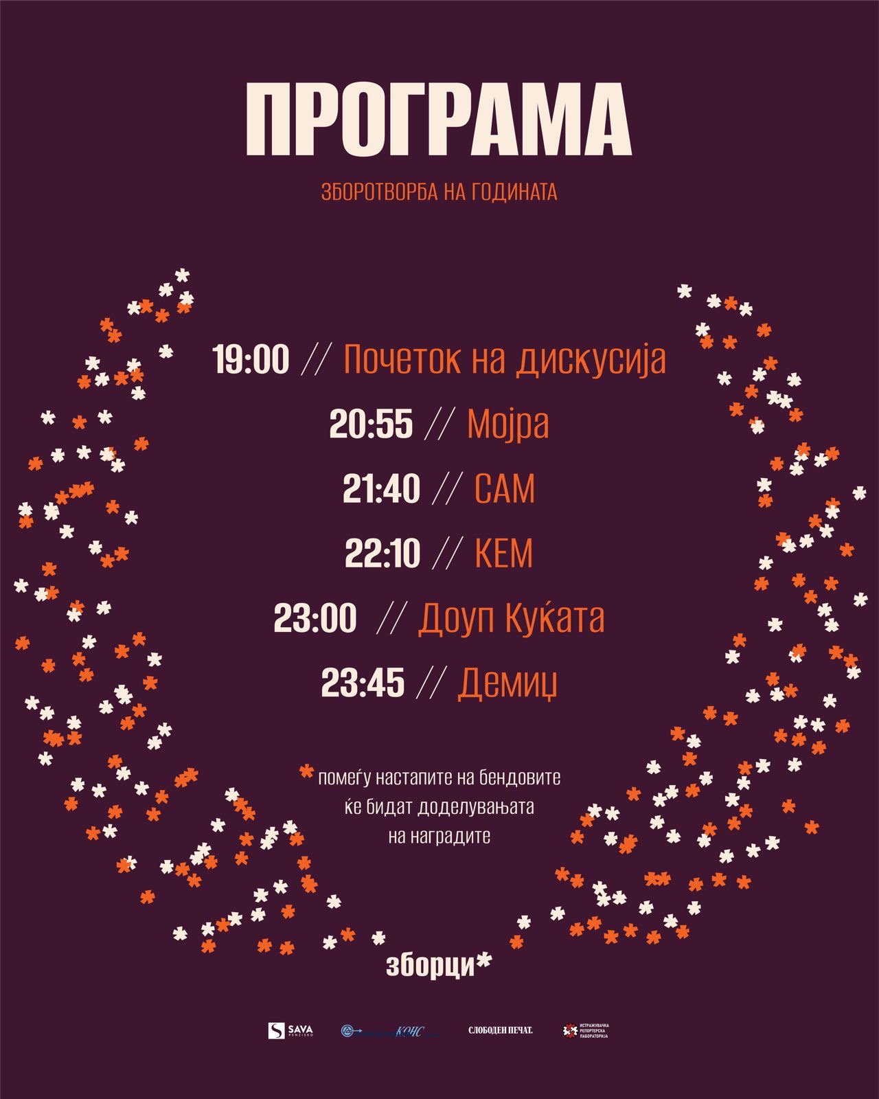 На настанот ќе бидат доделени три награди – за прво, второ и трето место во изборот за „Збор на годината“. На конкурсот беа пријавени повеќе од 400 зборови, а жири-комисија составена од професори, лектори, текстописци и поети ги одбра трите најкреативни. По доделувањето на наградите, забавата ќе продолжи со настапите на МОЈРА, С.А.М, КЕМ и ДОУП КУЌАТА, млади и прогресивни македонски бендови кои ќе ја заокружат вечерта посветена на славење на нашиот јазик.