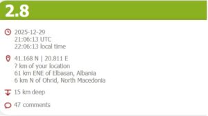 Телеметриската сеизмолошка мрежа на Република Северна Македонија, при Природно-математичкиот факултет во Скопје, исто така вечерва во 22 часот и 6 минути регистрира земјотрес чиј епицентар потекнува од епицентралното подрачје Пештани-Охрид-Струга, на околу 103 км југозападно од Скопје, со Рихтерова локална магнитуда, ML2.8.